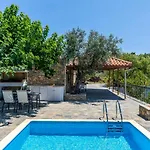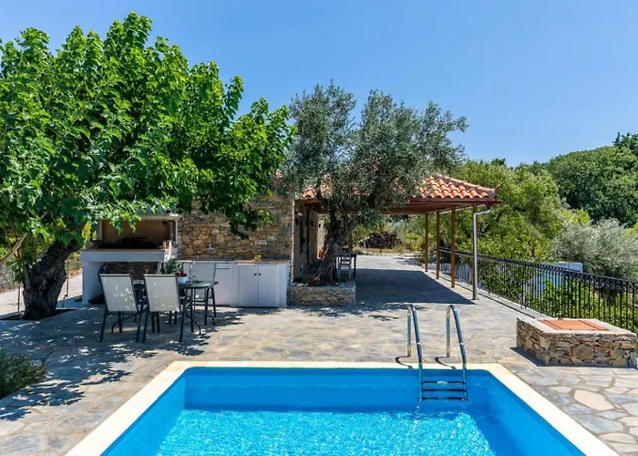 Gli ospiti possono godere di una vista sulla spiaggia sulla piscina dalla terrazza presso la Oak Tree Cottage Pefkias, situata a una distanza di 5 km dalla Spiaggia di Valanio.